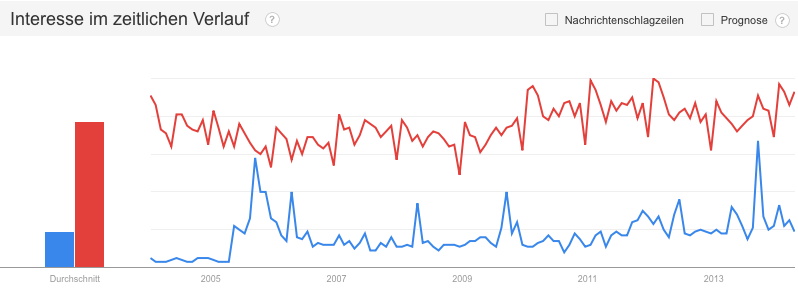 Beispielsweise indem für 52 Wochen jeden Montag die Auto-Complete-Vorschläge zu einem Suchbegriff dargestellt werden und daneben die Ereignisse, die eine Veränderung bewirkt haben. Beispielsweise „Angela Merkel“ – dazu werden heute nur „Twitter“, „Facebook“ und „Gehalt“ angeboten. Es wäre nicht nur praktisch, sondern auch akzeptanzfördernd, eine solche Entwicklung nachvollziehen zu können. Die reine Abrufhäufigkeit kann es nicht sein. Vergleicht man in Google Trends das Interesse an den drei Begriffspaaren, so zeigt sich die Diskrepanz zwischen Interesse und Platzierung: