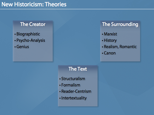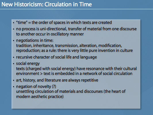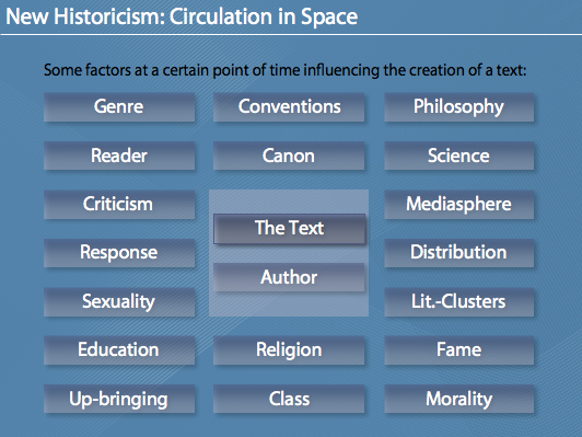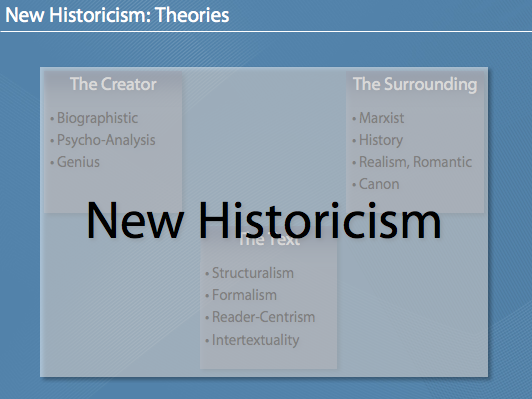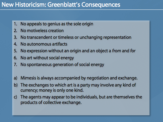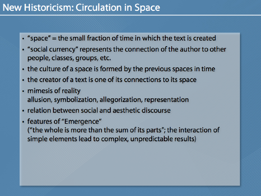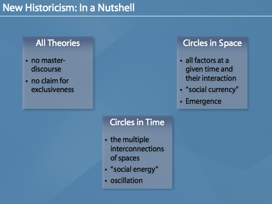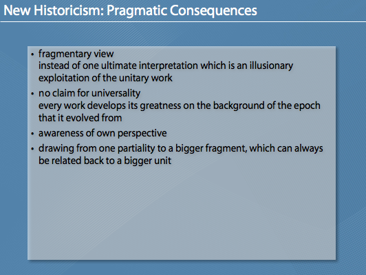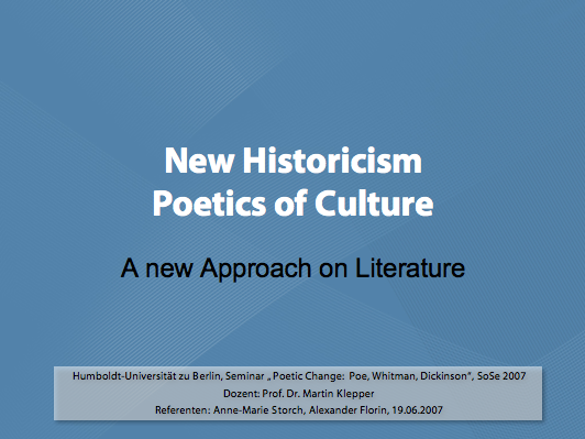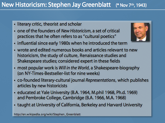 Die Folien zu meinem Referat über „New Historicism“. Das Referat (und daher auch die Folien) sind auf Englisch. Dabei wird auch der „Erfinder“ des New Historicism, Stephen Greenblatt, vorgestellt. Interessant ist vor allem der kulturelle, gesellschaftliche Kontext (in Raum und Zeit/space and time) der bei der Auseinandersetzung mit Literatur vorgeschlagen wird bzw. die Entstehung von literarischen Werken (bewusst und unbewusst) beeinflusst.