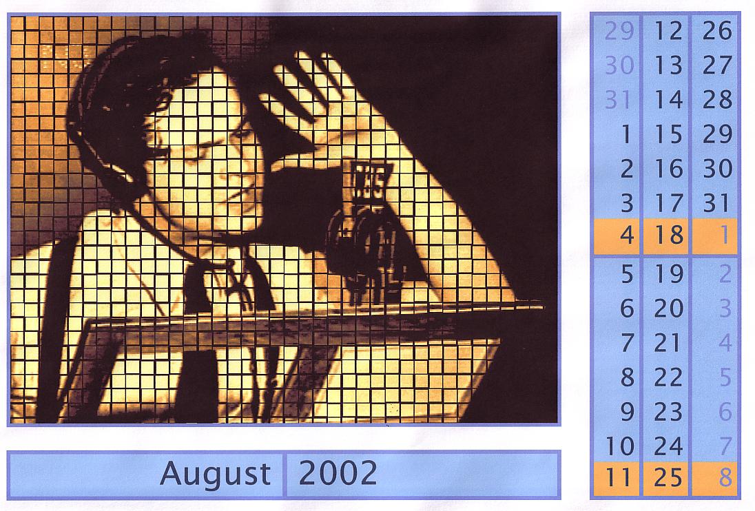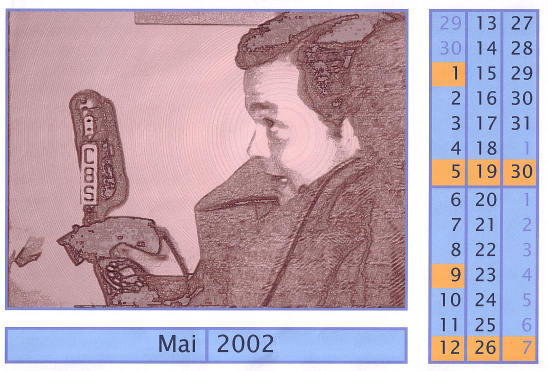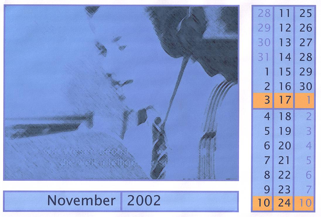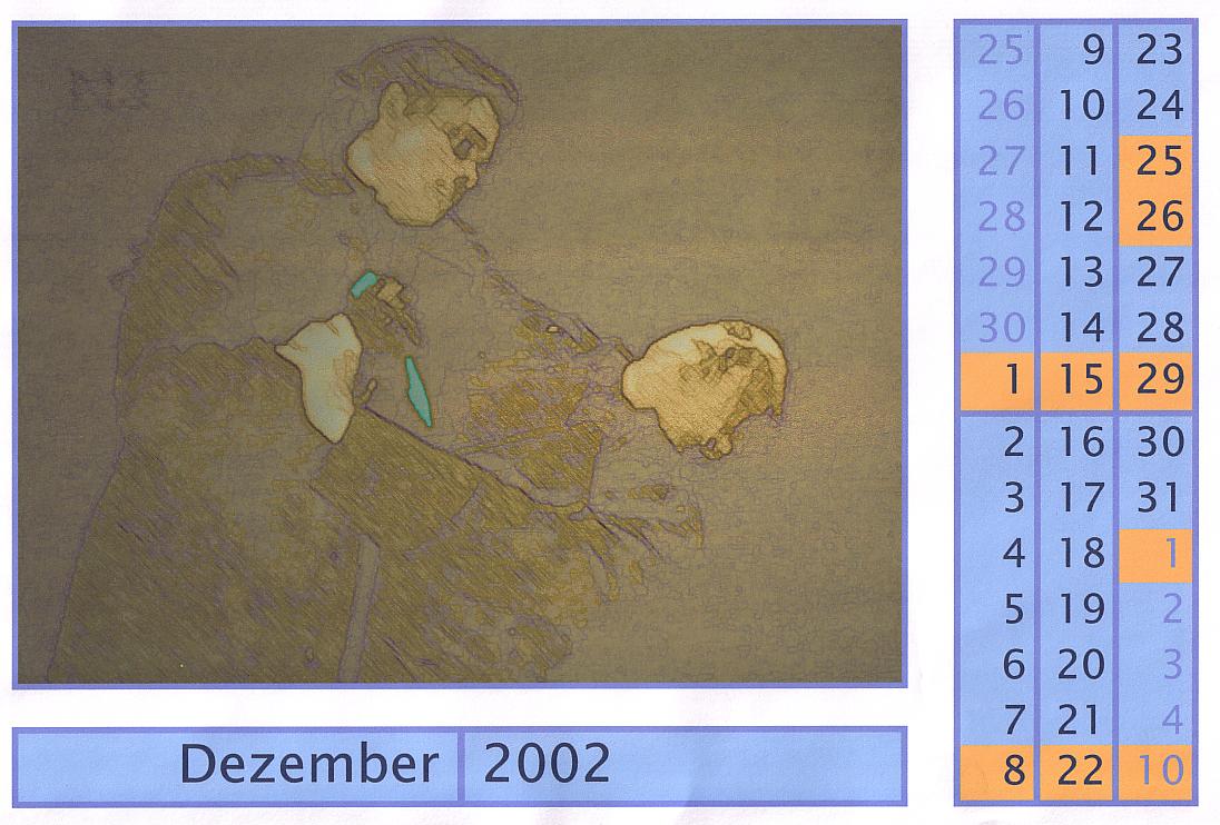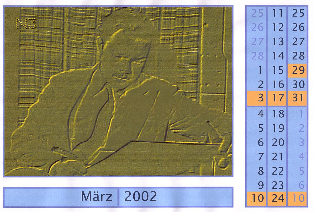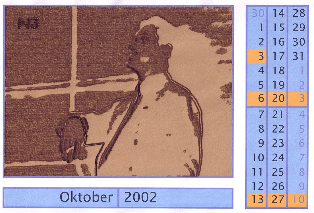 Auch ohne Anlass dachte ich, dass ein Kalender mit Fotos von Orson Welles schön werden könnte. Es gab letztendlich drei Versionen, von denen dies die gelungenste darstellt. Die Fotos stammen alle aus der Dokumentation „Der Krieg um Citizen Kane“, wurden per Screenshot auf Festplatte gebannt und anschließend mit PhotoImpact verfremdet. Dabei beließ ich absichtlich das N3-Logo (wo die Doku lief) in den Bildern.